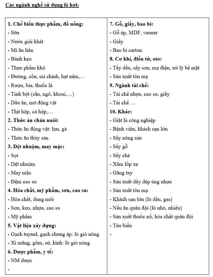• Các hệ thống đốt LPG, CNG, LNG và DO sẽ không cần hệ thống xử lý khí thải riêng, vì các loại nhiên liệu này khi đốt xong thì thành phần khói thải đã đáp ứng điều kiện môi trường của Việt Nam. Riêng đối với nhiên liệu dầu FO, trong dầu FO có chứa hàm lượng lưu huỳnh cao, nên khi đốt xong trong khí thải có chứa hàm lượng SO2 cao nên phải có một hệ thống xử lý khí thải trước khi thải ra môi trường.